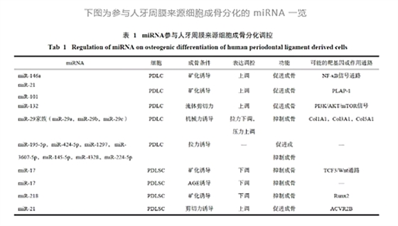 人牙周膜細胞 (PDLC) 是牙周膜中最常見的細胞,不斷形成新的主纖維、牙骨質,并改建牙槽骨,對牙周組織的修復十分重要,是牙周治療后形成牙齦與牙根面新附著的主要細胞來源,其成骨能力與牙周修復功能息息相關。miRNA 在 PDLC 礦化誘導和機械力誘導的成骨作用中均發(fā)揮了重要作用。